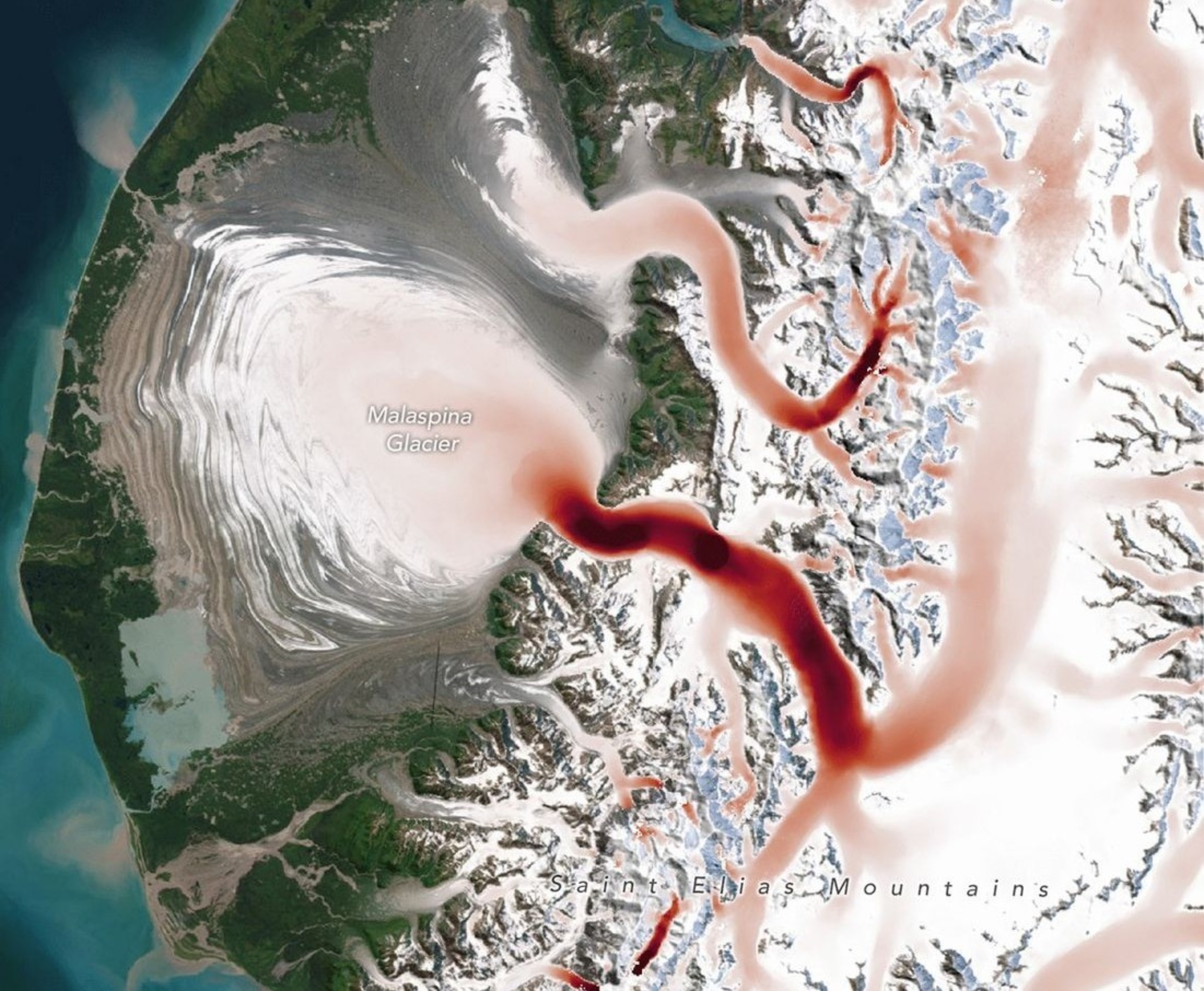 Today’s Image of the Day from NASA Earth Observatory captures Malaspina Glacier, a massive river of ice in southeastern Alaska that stretches from the Saint Elias Mountains onto the coastal plain.