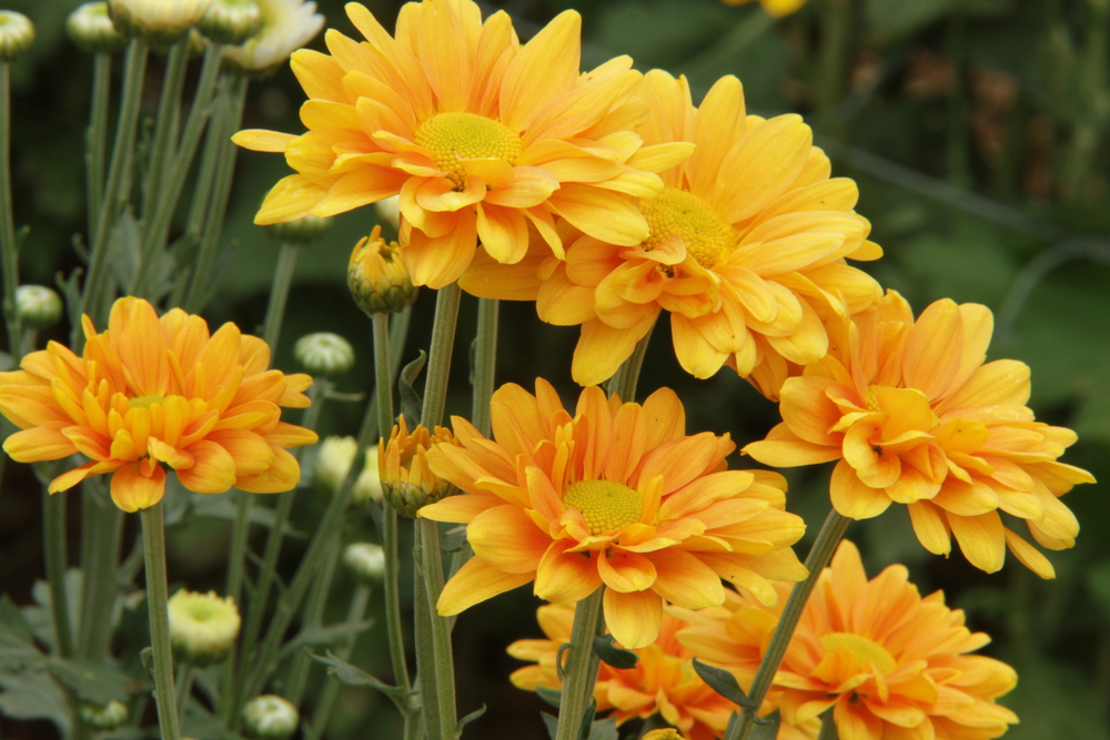 Wild flowers taxa are herbaceous perennial plants or subshrubs. There are also a range of annual chrysanthemums including C.carinatum, C.coronarium, C.inodorum, C.multicaule, C.nivellii, and C.segetum. They have alternately arranged leaves divided into leaflets with toothed or occasionally smooth edges. The compound inflorescence is an array of several flower heads, or sometimes a solitary head.The head has a base covered in layers of phyllaries. The simple row of ray florets is white, yellow, or red; many horticultural specimens have been bred to bear many rows of ray.