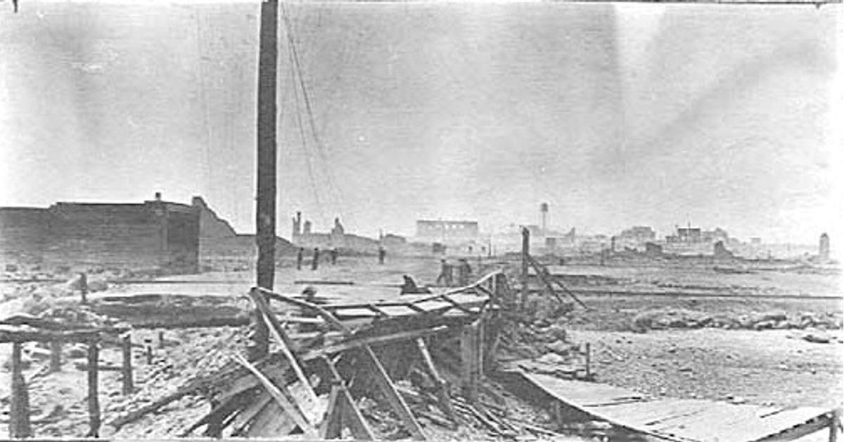After a two-month summer drought, combined with very high temperatures, several small fires started in the pine forests of Pine County, Minnesota. The fires’ spread apparently was due to the then-common method of lumber harvesting, wherein trees were stripped of their branches in place; these branches littered the ground with flammable debris. Also contributing was a temperature inversion that trapped the gases from the fires. The scattered blazes united into a firestorm. The temperature rose to at least 2,000 °F (1,100 °C). Barrels of nails melted into one mass, and in the yards of the Eastern Minnesota Railroad, the wheels of the cars fused with the rails. Some residents escaped by climbing into wells, ponds, or the Grindstone River. Others clambered aboard two crowded trains that pulled out of the threatened town minutes ahead of the fire.