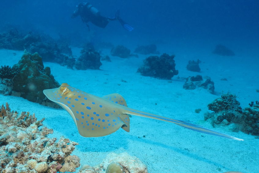 A skate cruises along the sea floor. Also the common skate or blue skate is the largest skate in the world.