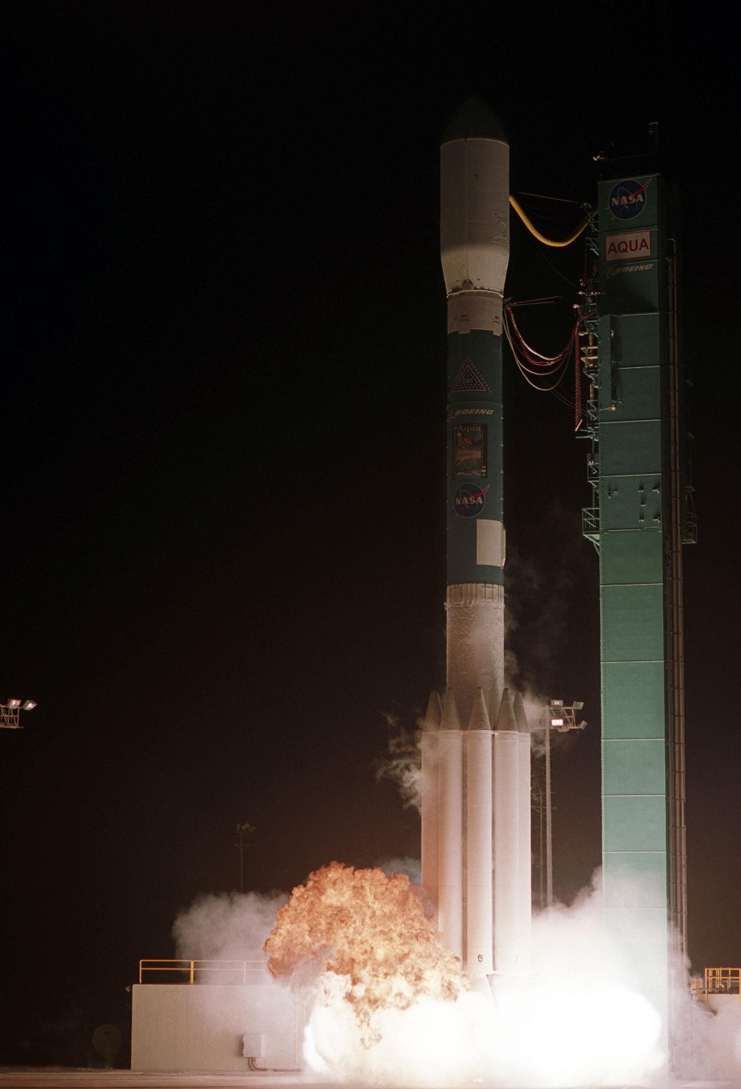 VANDENBERG AIR FORCE BASE, CALIFORNIA. NASA’s latest Earth observing satellite, Aqua, lifts off from the Western Test Range of Vandenberg Air Force Base, Calif., aboard a Delta II rocket at 2:55 a.m. PDT. Also Aqua is dedicated to advancing our understanding of Earth’s water cycle and our environment.