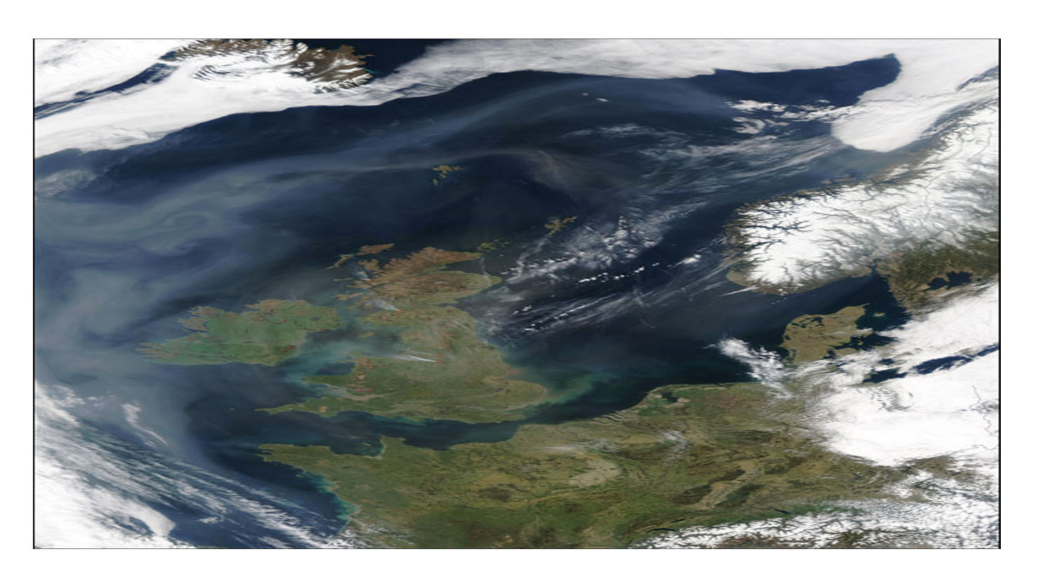 On April 18, 2003, African Dust Reaches Northern Europe a mixture of dust from the Sahara Desert, air pollution, and smoke lingers over the Atlantic Ocean (left). This image shows numerous fires (red dots) burning in the United Kingdom (left of center) and the Republic of Ireland (farther left). A few scattered fires are burning in other parts of the image. This image was acquired by the Moderate Resolution Imaging Spectroradiometer (MODIS) on the Aqua satellite.