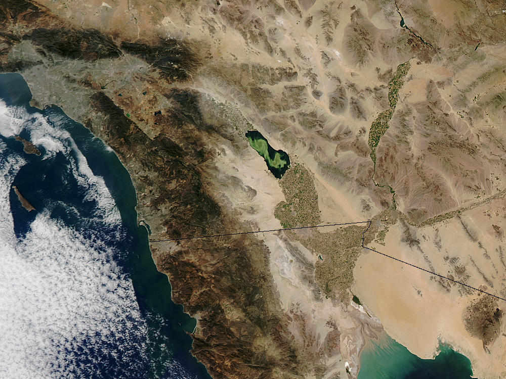 Algal Bloom in the Salton Sea, California. The Salton Sea, shown in this series of Moderate Resolution Imaging Spectroradiometer (MODIS) images, is California’s largest lake. The current Salton Sea formed in 1905 when an irrigation canal ruptured, diverting the Colorado River into the Salton Basin in southeastern California. The basin filled, resulting in the lake that exists today. At 227 feet below sea level, the basin has filled with flood water from the Colorado River many times in the past. Around 700 A.D., the Colorado River became clogged with silt and changed its course to flow into the Salton Basin. The lake that formed there, Lake Cahuilla, seems to have persisted until about 300 years ago. Since then, occasional lakes have filled the basin, and then evaporated away. Enriched by silt, the former lake bottom provides fertile farmland, and can be clearly seen as green against the tan of the surrounding desert in these true-color images.