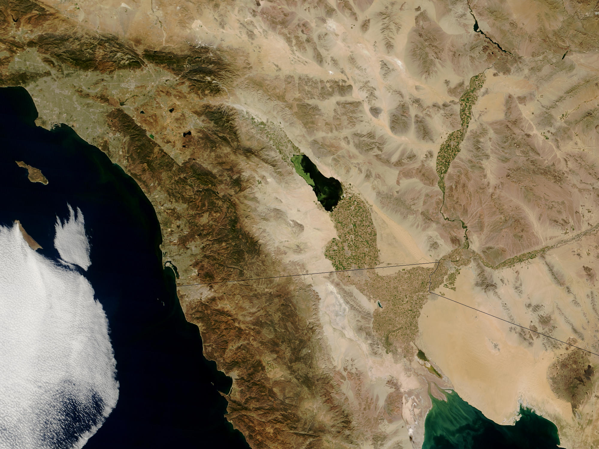 The Algal Bloom in Salton Sea, California shown in this series of Moderate Resolution Imaging Spectroradiometer (MODIS) images. Also is California’s largest lake. The current Salton Sea formed in 1905 when an irrigation canal ruptured, diverting the Colorado River into the Salton Basin in southeastern California. The basin filled, resulting in the lake that exists today. At 227 feet below sea level, the basin has filled with flood water from the Colorado River many times in the past. Around 700 A.D., the Colorado River became clogged with silt and changed its course to flow into the Salton Basin. The lake that formed there, Lake Cahuilla, seems to have persisted until about 300 years ago. Since then, occasional lakes have filled the basin, and then evaporated away. Enriched by silt, the former lake bottom provides fertile farmland, and can be clearly seen as green against the tan of the surrounding desert in these true-color images.