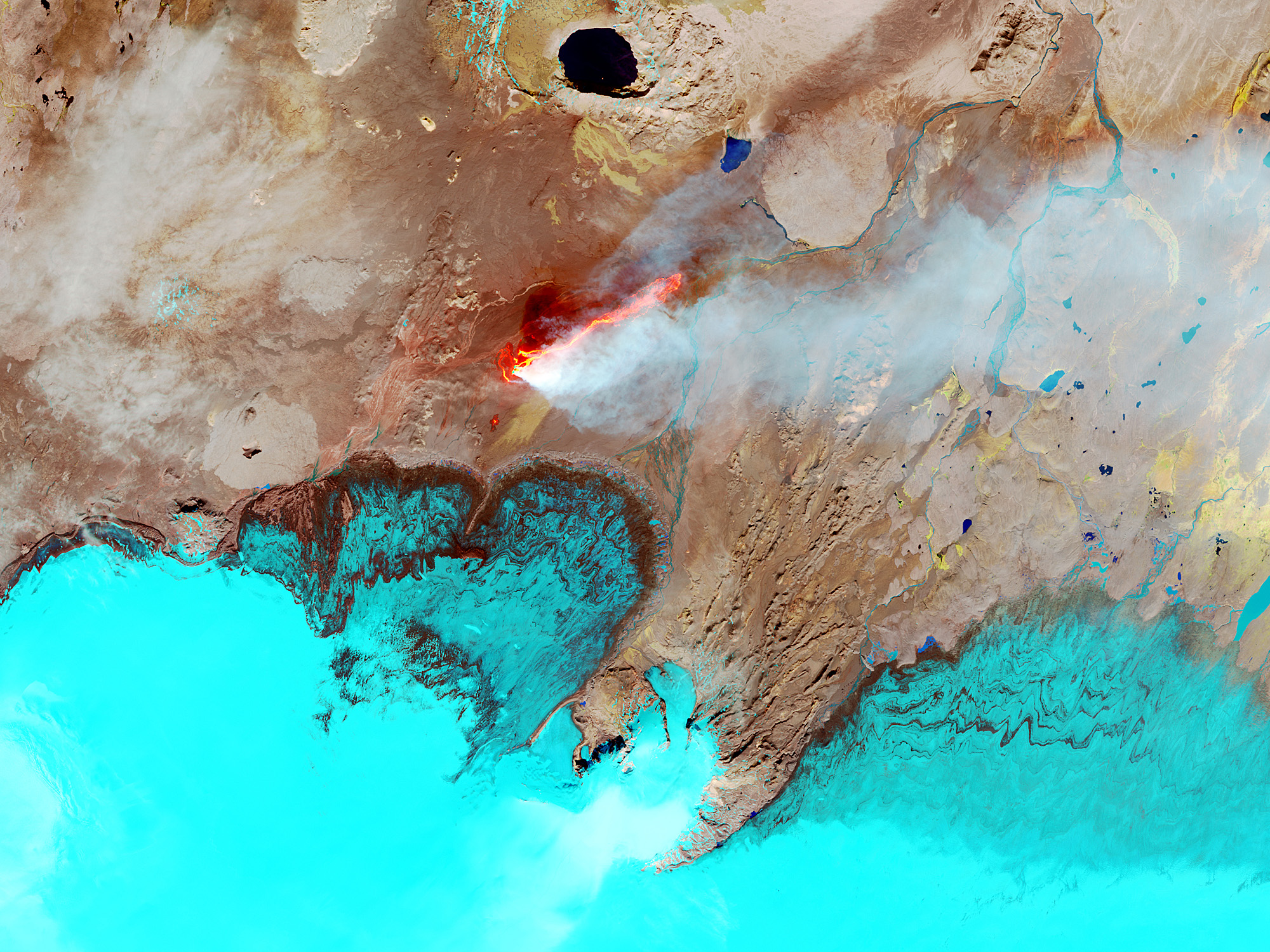 The Operational Land Imager (OLI) on Landsat 8 captured this pair of false-color images of the Holuhraun lava field. The images combine shortwave infrared, near infrared, and red light (OLI bands 6-5-4) to better show variations in the temperature of the lava. This particular band combination also makes it easier to see through the plume of steam and gas rising from the fissure.