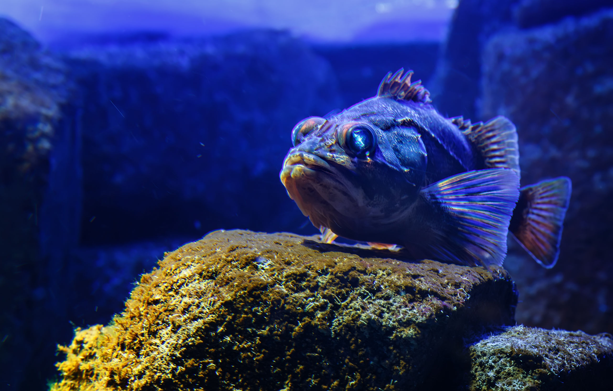 An adult blackbelly rosefish rests under a branch of coral. Blackbelly rosefish is a robust fish with a large head with the spination described for the genus and without tabs or tentacles.