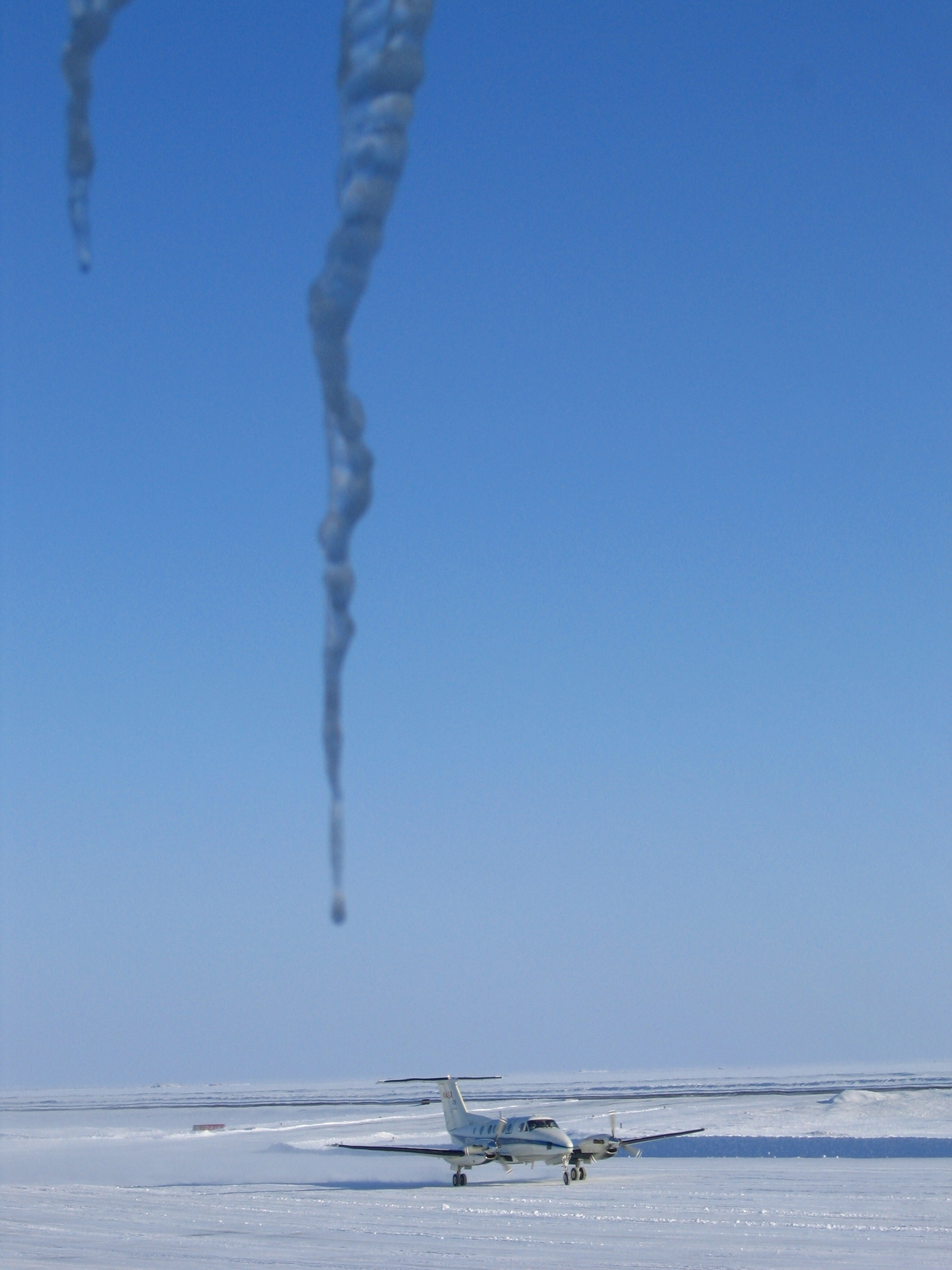An Icy B-200 in Alaska. Peering through icicles on the hangar in Barrow, Alaska, Mike Obland, of NASA’s Langley Research Center, captures an icy view of the King Air B-200 readying for takeoff. Credit: NASA/Mike Obland