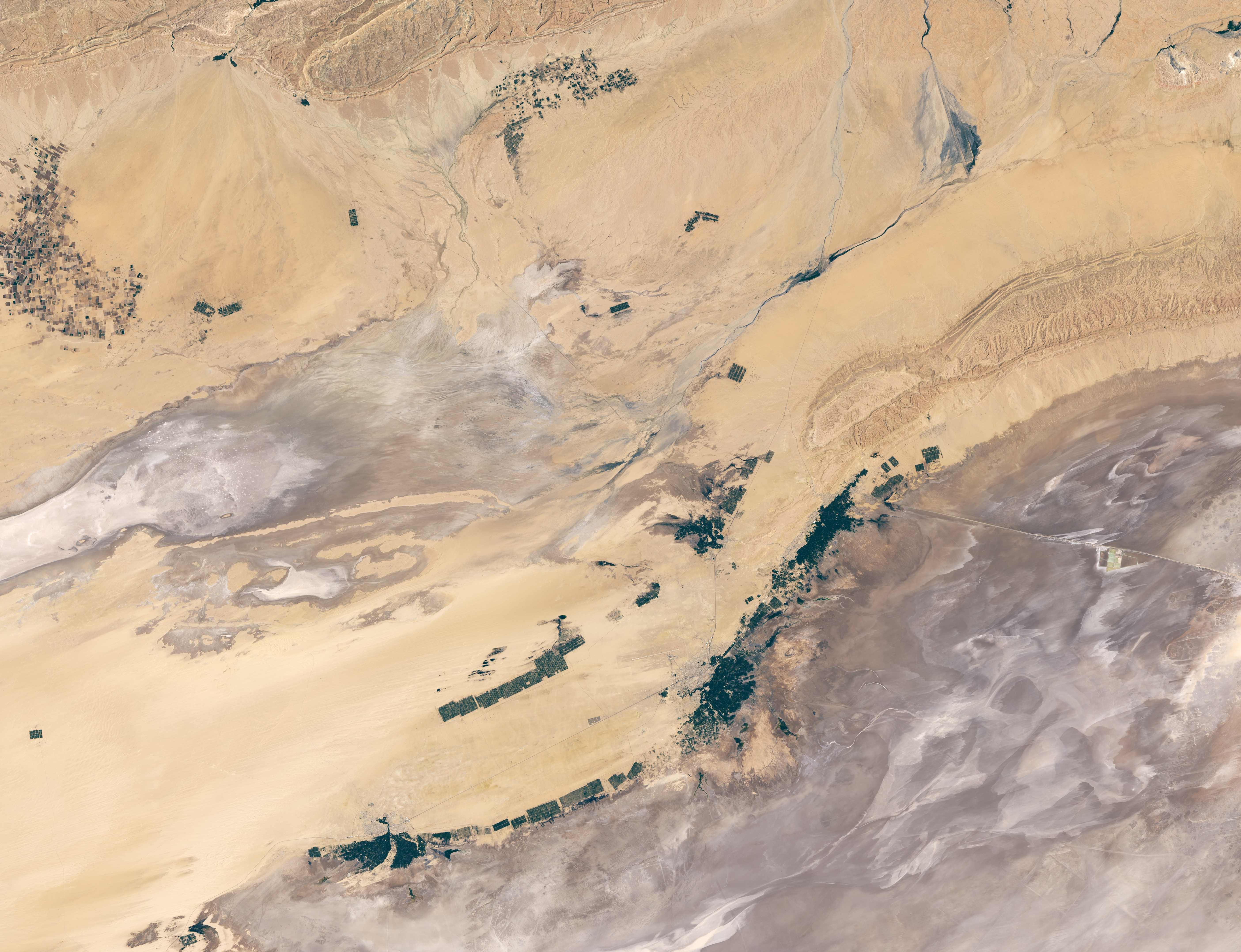 The sandy terrain contrasts with the darker features of the large endorheic salt lake Chott el Djerid.