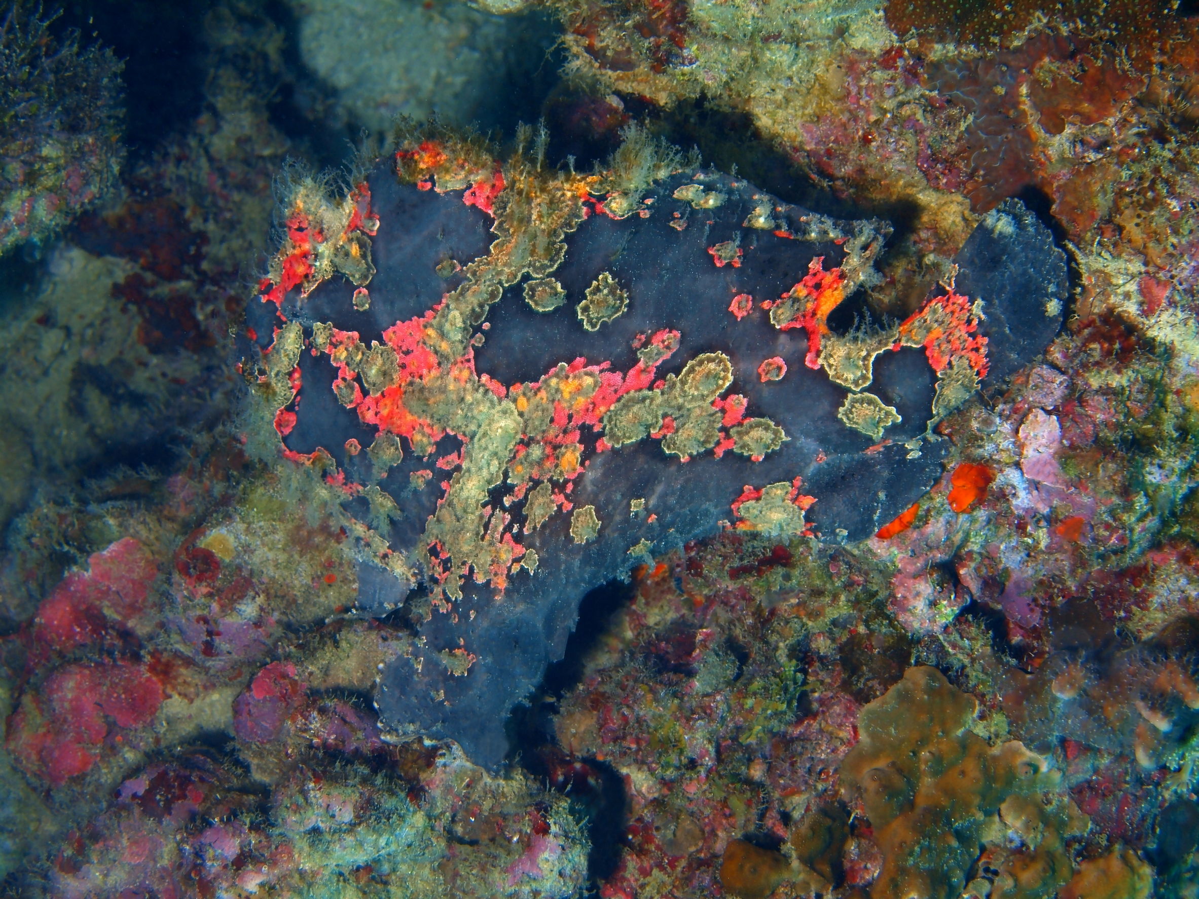 Due to its flat shape and coloration, the anglerfish among coral is difficult to distinguish as it rests on the seafloor.