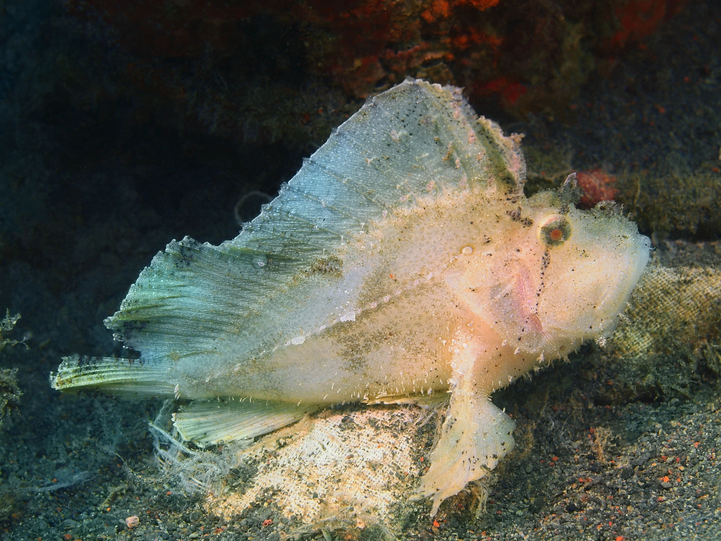 The anglerfish wiggles a bait, or esca (see arrow) to lure its prey. Notice the branched skin flaps that help the undersea angler blend into its surroundings.