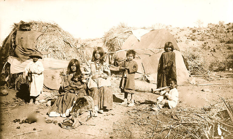 A group of Apache children and a tired (we assume) adult play outside their thatched huts. These homes are wickiups and have wooden frames covered in yucca fibers and other types of brush. Highland sections of the Apaches were big fans of this type of structure. Photo Credit: Gentry/Buyenlarge/Getty Images