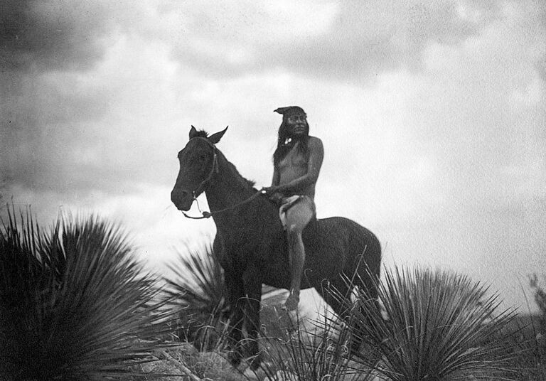Of the Apache nation, the man on this horse belonged to peoples who moved across America, settling along mountains, valleys, deserts, canyons, and even a section in the Great Plains called Apacheria. When Spanish and Mexican (and later United States) soldiers tried to invade, the Apaches strategically fought them with everything they had. Photo Credit: Smith Collection/Gado/Getty Images