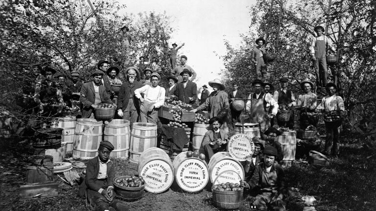 This photo from circa 1880 shows a bountiful apple harvest in Waynesboro, Virginia, at the Rose Cliff Fruit Farm. According to the legend printed on the barrel ends, these apples are of the York Imperial variety, apparently an excellent choice for cooking. Sadly, this orchard was sold in 1927, and houses were built on the land. Photo Credit: Library of Congress/Corbis/VCG via Getty Images