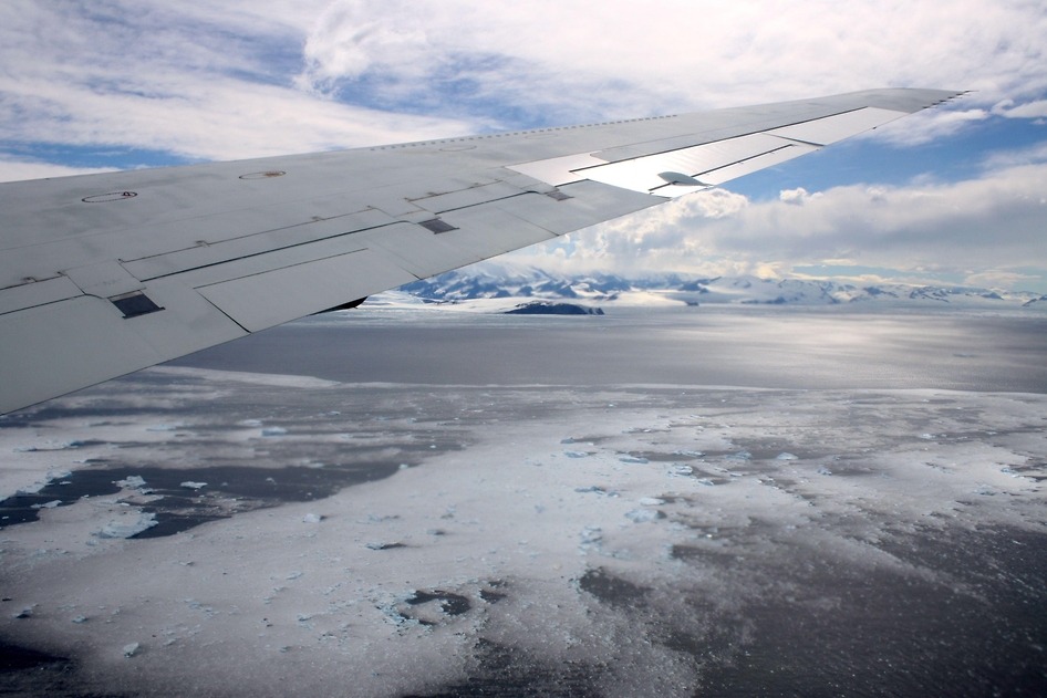 After flying from the mission base in Punta Arenas, Chile, sea ice appears as the DC-8 approaches the shore of the Antarctic Peninsula, the target of the science flight on Nov. 13, 2010. Credit: NASA/Kathryn Hansen