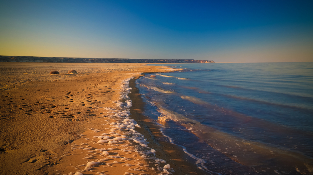 Every year the Aral Sea shrinks a little more due to 40 years of agricultural policies that let farmers in Kazakhstan and Uzbekistan. The Sea is now so shallow that sediment appears almost ever-present, making the waters look milky tan and green. Discolor of sea.