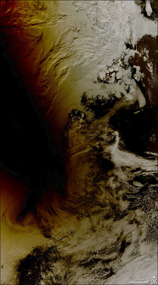In the area shown in the image, the sun was completely obscured for about two minutes. As Earth rotated, the shadow moved southeast across the surface. At the same time, the satellite crossed the Arctic with its path nearly perpendicular to the eclipse.