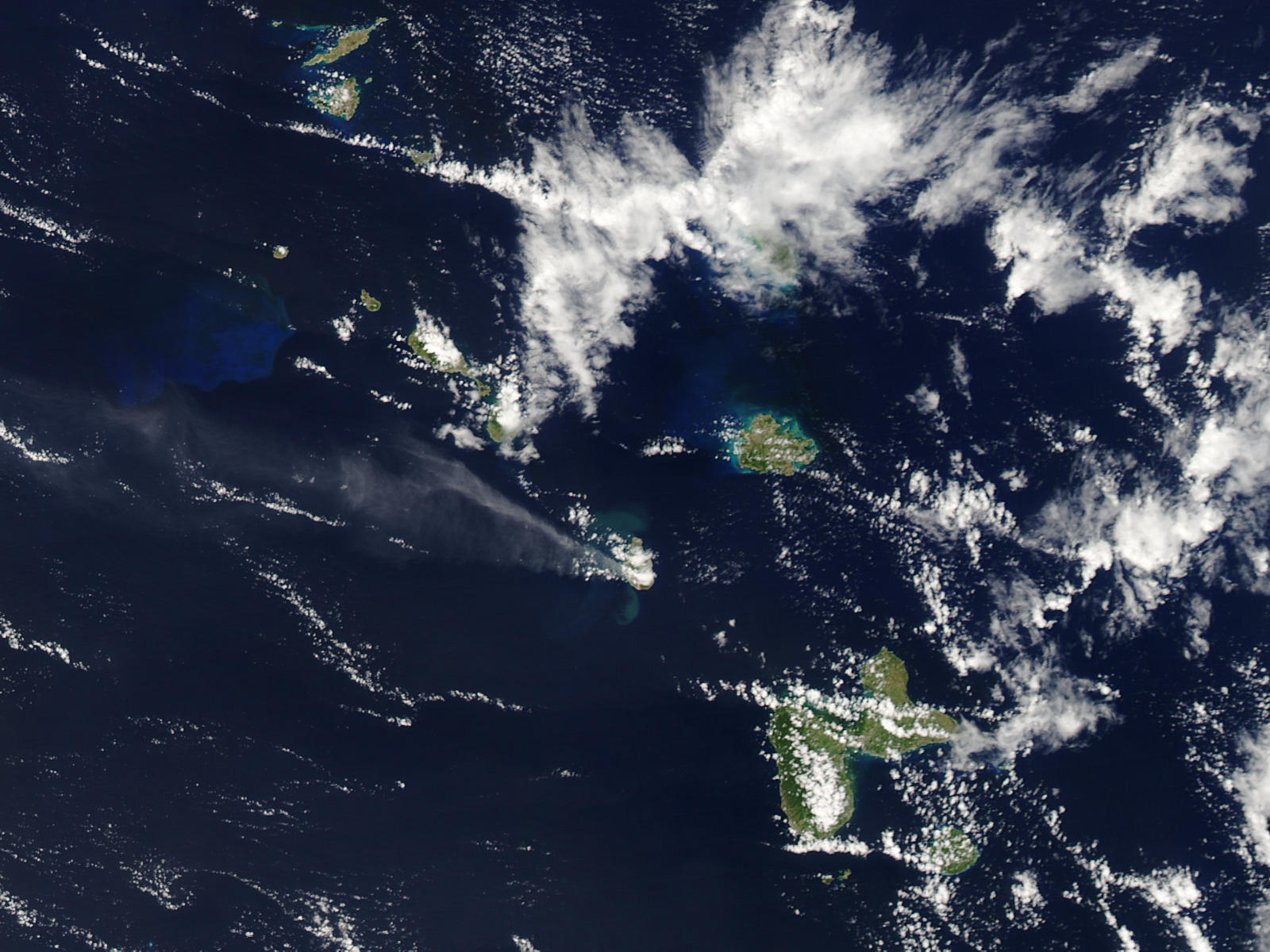 This Moderate Resolution Imaging Spectroradiometer (MODIS) image from the Aqua satellite on July 14, 2003, shows the ash plume from the erupting volcano (center) drifting westward from the southern end of Montserrat, while the waters surrounding the island are bright blue-green, probably from the ash scattered over the surface. Although Ash Plume From Soufriere Hills, Montserrat was caused by the explosion, the island knew they had to be prepared prior. Also this is common on any island with volcanos.