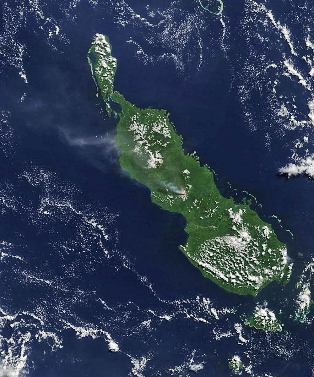 Ash plume from Mount Bagana, Bougainville Island. The red hotspot and the rising ash plume mark the location of Mount Bagana, a massively symmetrical volcano that rises about 1750 m (1.08 mi) high, towering above the tropical vegetation.