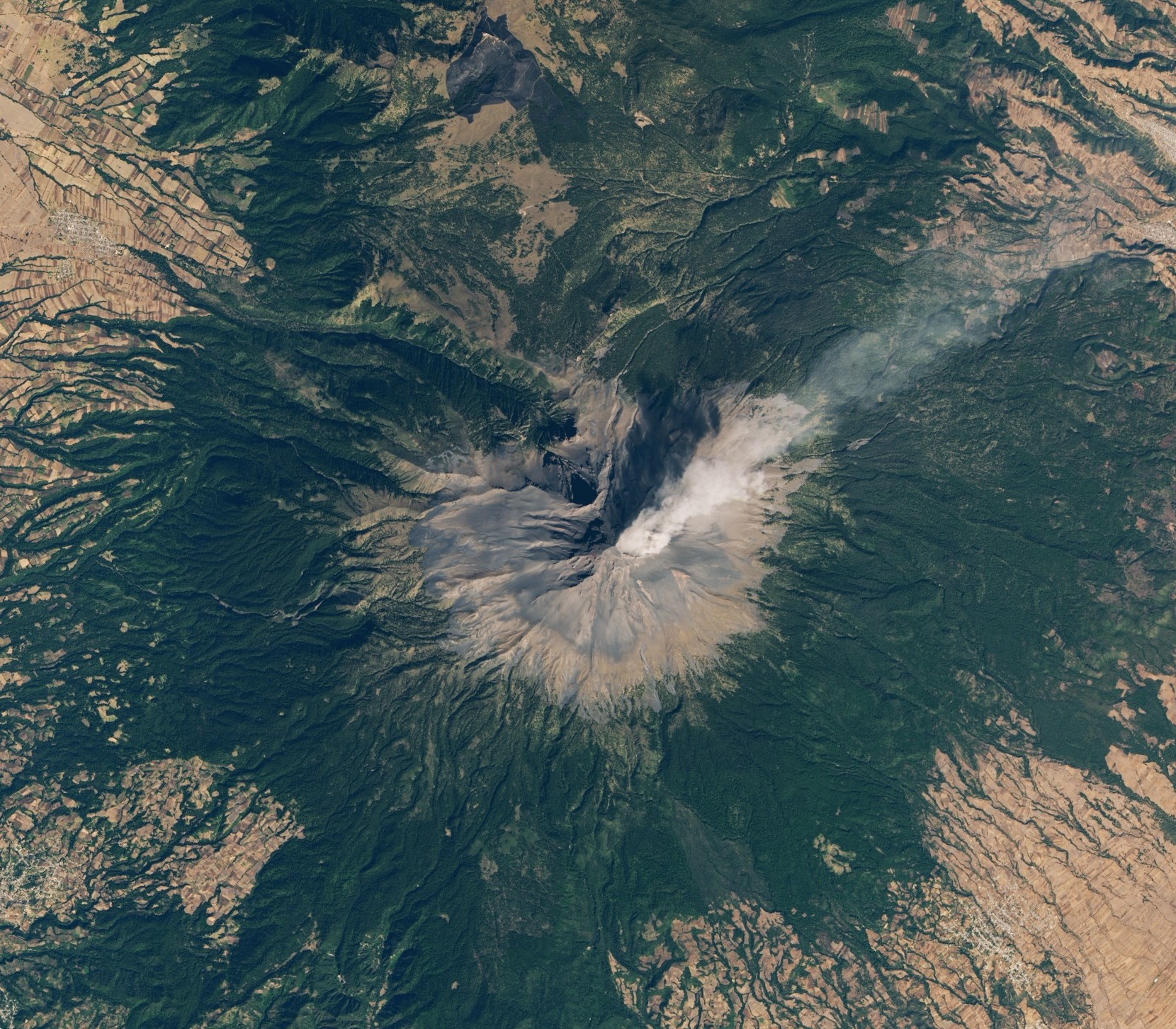 The image was captured on January 2, 2021 by the Operational Land Imager (OLI) on Landsat 8.Popocatépetl is an active stratovolcano, located in the states of Puebla, Morelos and Mexico, in central Mexico, and lies in the eastern half of the Trans-Mexican volcanic belt. At 5,426 m (17,802 ft) it is the second highest peak in Mexico, after Citlaltépetl (Pico de Orizaba) at 5,636 m (18,491 ft). It is linked to the twin volcano of Iztaccihuatl to the north by the high saddle known as the “Paso de Cortés”. Izta-Popo Zoquiapan National Park, wherein the two volcanoes are located, is named after them. Popocatépetl is 70 km (43 mi) southeast of Mexico City,