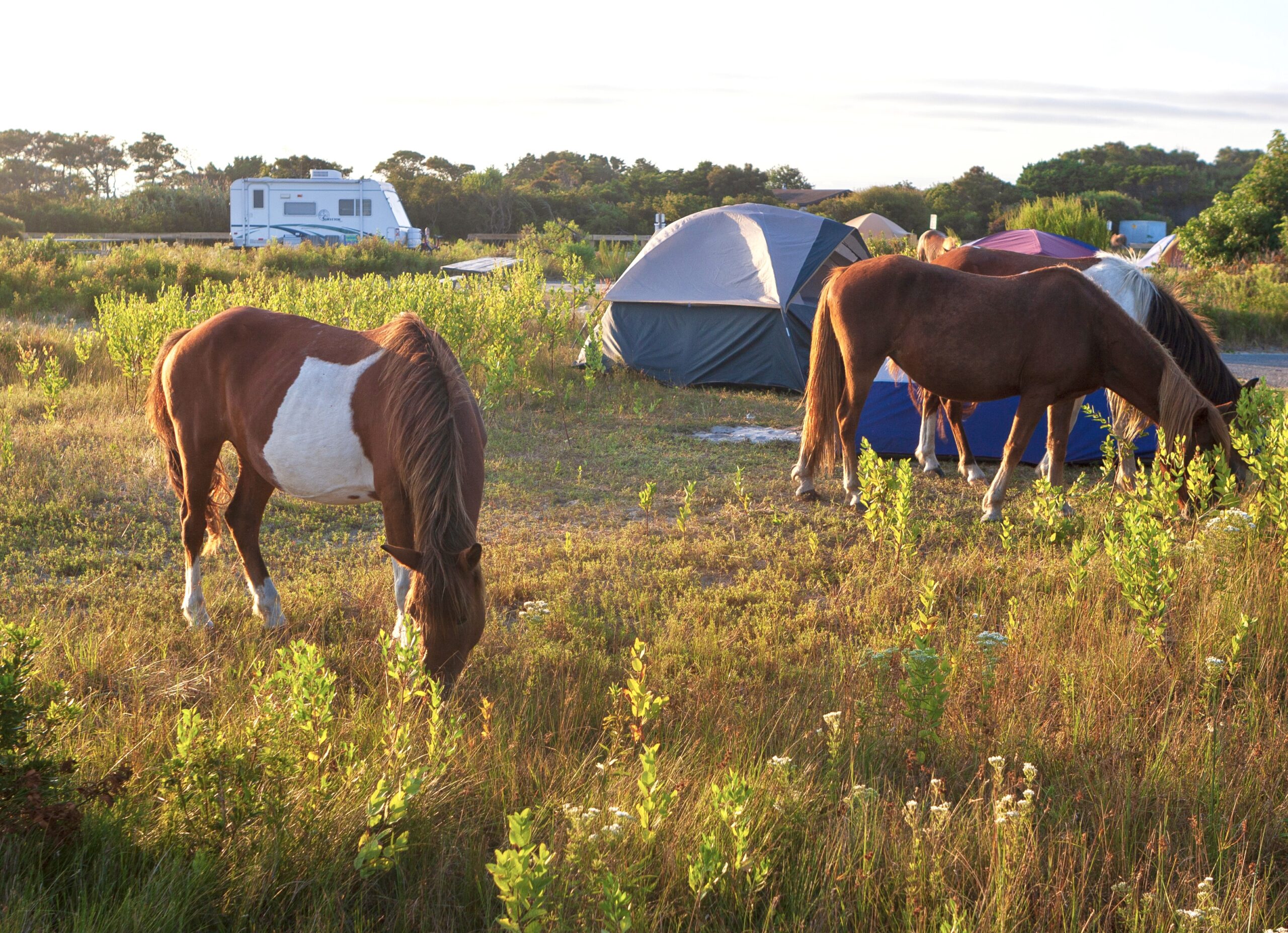 Camping is available only in the Maryland district of Assateague Island. Reservations are required from March 15 through November 15. Campsite reservations are available six months in advance. Oceanside Drive-in: Tents, trailers and recreational vehicles (no hookups). Sites have a picnic table and a fire ring. Oceanside Walk-in: Tent-only sites, located 100-200 feet from centralized parking areas. Sites have a picnic table and a fire ring. Walk-in sites are closed from November 16 through March 14. Bayside Drive-in: Tents, trailers and recreational vehicles (no hookups). Sites have a picnic table and a fire ring. A Drive-In “Generator-Free Zone” is located in Bayside B Loop. Horse Camp: There are 2 campsites for horse camping available October 16 through April 14. Each site accommodates up to 6 people and 6 horses. Assateague has two oceanside and four bayside camping areas in Maryland for visitors who wish to backpack or paddle the island.