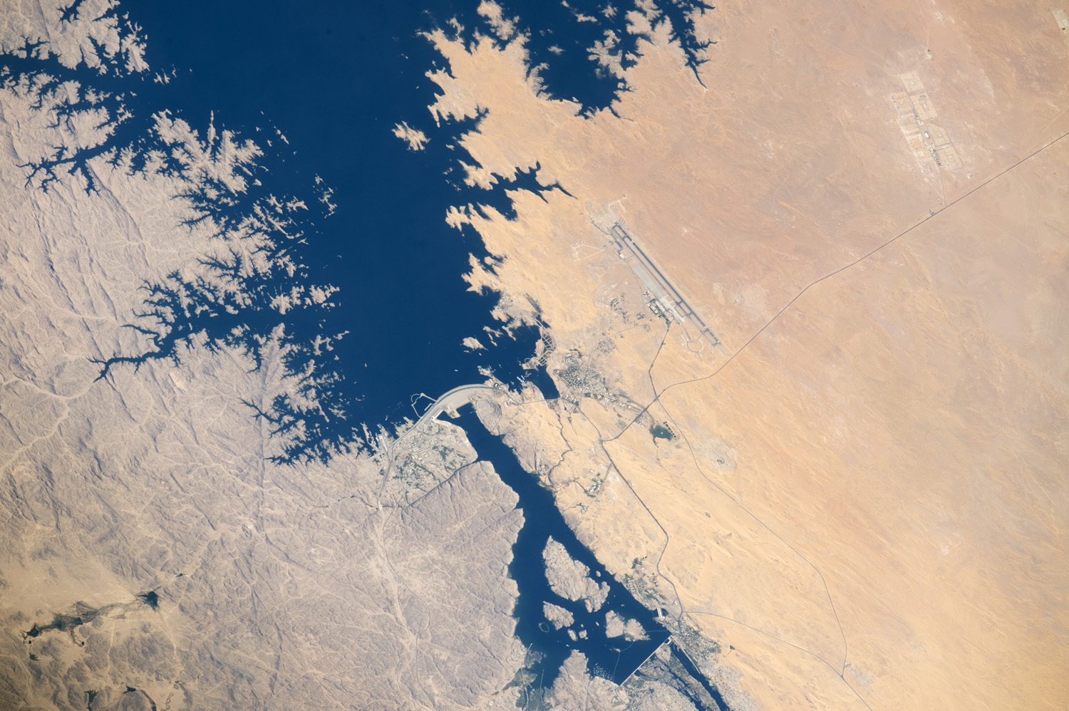 Astronauts aboard the International Space Station used a high magnification lens to capture the details of the Aswan High Dam on the River Nile in southern Egypt. This vast engineering project was started in 1960 and completed in 1970, and it is one of the largest earthen embankment dams in the world at 3,830 meters (12,565 feet) long and nearly 1,000 meters (3,281 feet) wide.