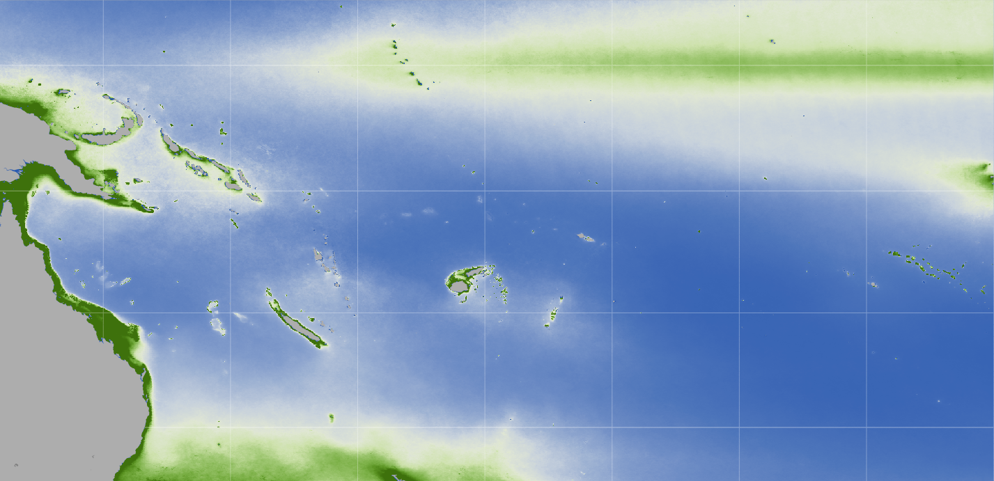 These green “hot spots” occur around the majority of the islands in the Pacific, indicating high levels of chlorophyll – and phytoplankton – in those areas. The amount of activity around the Gilbert Islands is particularly intriguing, as the islands themselves are far smaller in size than the phytoplankton-filled areas around them.