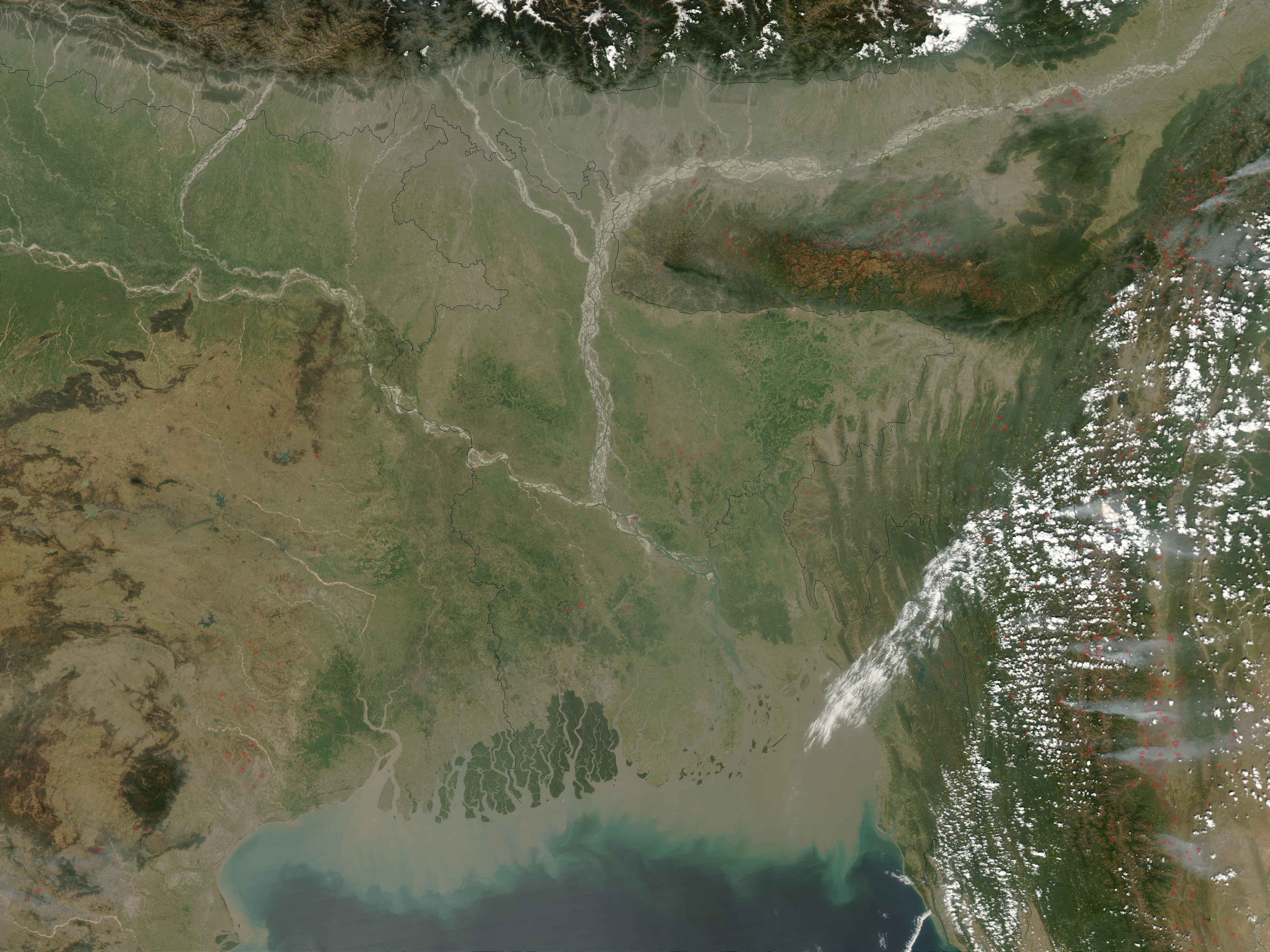 On March 5, 2003, the Moderate Resolution Imaging Spectroradiometer (MODIS) on the Aqua satellite detected fires (marked in red) in eastern India (bottom left), northeast India (top right), and western Myanmar (bottom right). A few scattered fires were detected in Bangladesh (center). In the false-color image of this scene, dark reddish burn scars stand out against bright green vegetation.