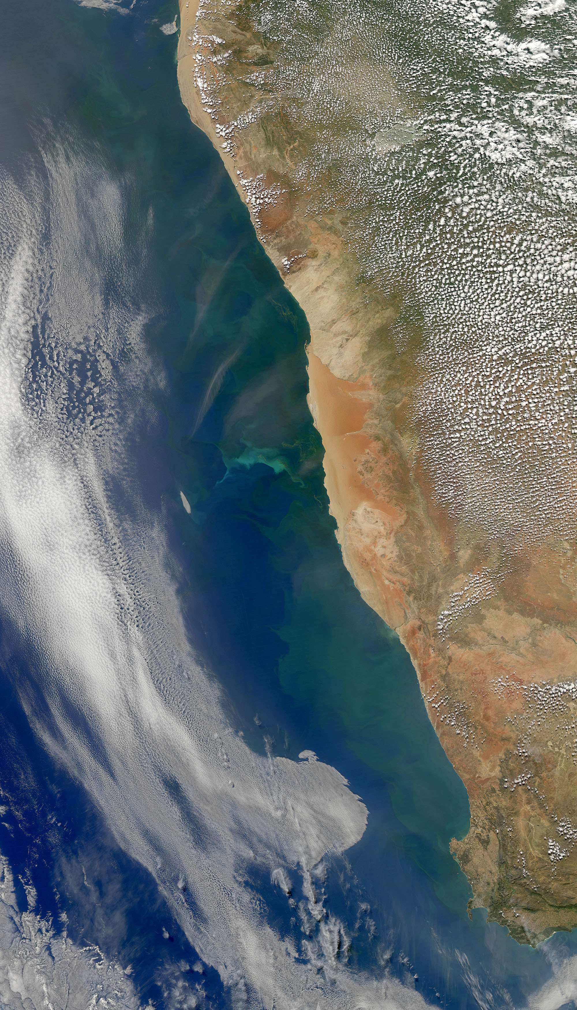 Just off the coast of Namibia, the Benguela Current flows along the ocean surface. It moves north and west along the coast from South Africa and is enriched by iron and other nutrients from the Southern Ocean and from dust blowing off African coastal deserts. Easterly winds push surface waters offshore and promote upwelling near the coast, which brings up cold, nutrient-rich waters from the deeper ocean. These interactions can make the ocean come alive with color.