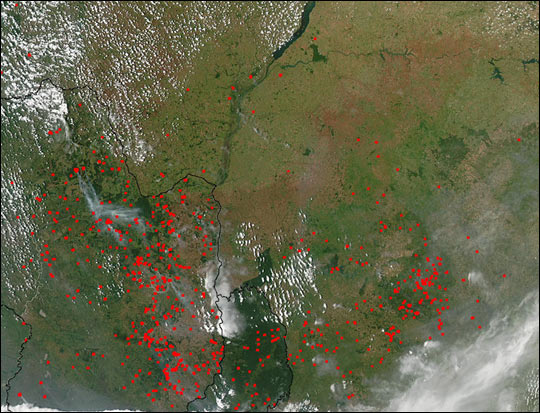 Biomass burning in Paraguay. On November 9, 2002, the Moderate Resolution Imaging Spectroradiometer (MODIS) on the Aqua satellite captured this true-color image. The pic of southeastern Paraguay (bottom left), Brazil (top and right), and far northeastern Argentina (bottom center).