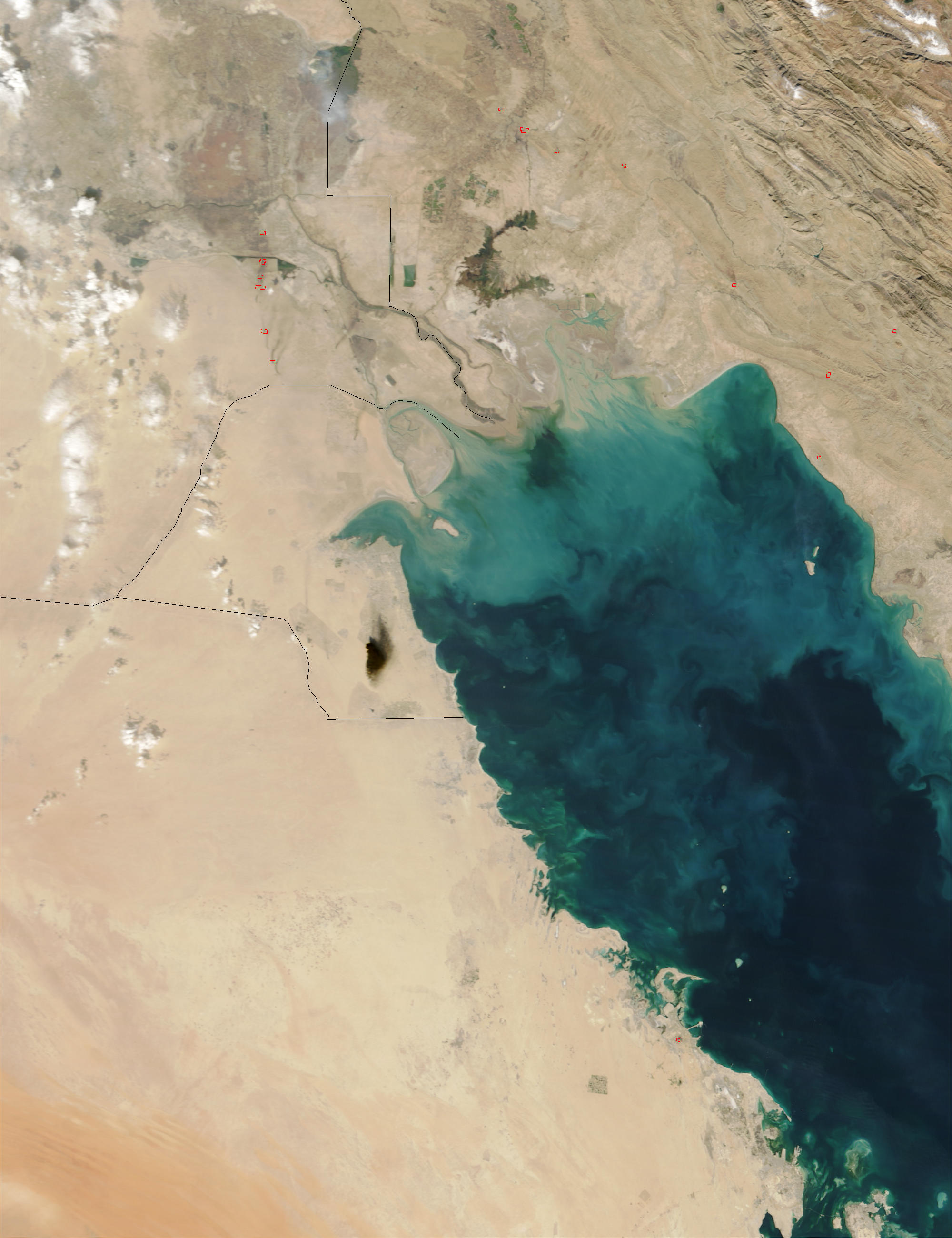The MODIS instruments also detected active fires, which are marked in red, in Iran (top), Iraq (upper left), and Saudi Arabia (bottom). All four countries in the image border The Persian Gulf (bottom right), which shows turquoise-blue swirls of sediment in the water. Black Smoke from Oil Fire in Kuwait