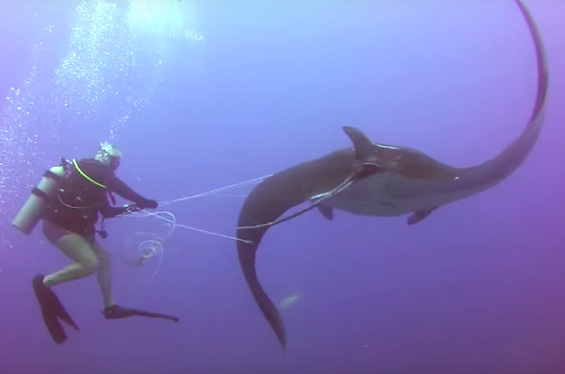 As the divers explore the ocean floor, a giant stingray swims straight up to them. That’s when they notice that the ray is caught in a fishing net and needs their help. They carefully untangled the stingray and it’s soon on its way again. But this particular video highlights another danger that rays face. Photo Credit: YouTube / Oceano VideoSub