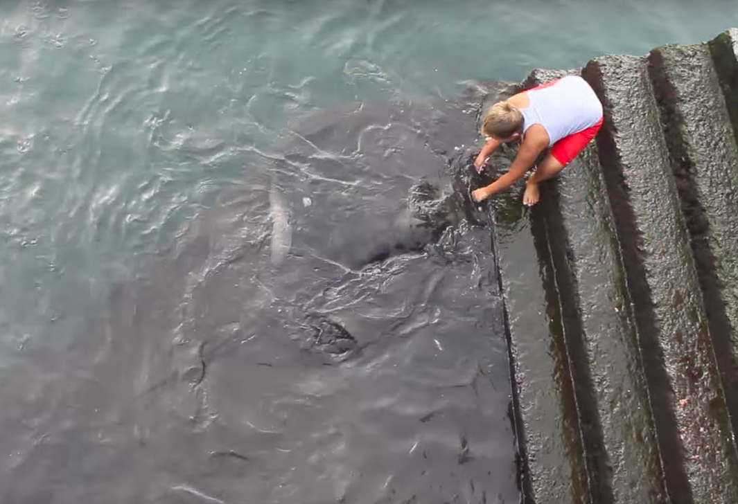 The crowd watched as the giant manta ray opened its wide mouth slightly expectantly. To which Joel fearlessly placed his hand inside and opened his fist. The onlookers could barely believe their eyes. Photo Credit: YouTube / gekkovision
