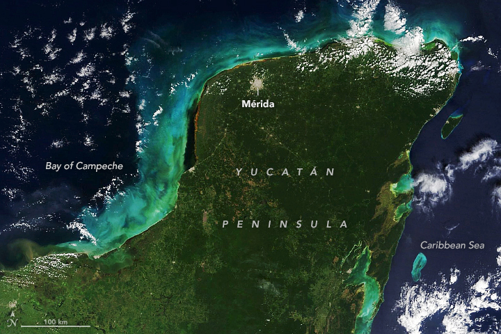 Today’s Image of the Day from NASA Earth Observatory features brightly colored sediment swirls along the coast of the Yucatan Peninsula in Mexico.