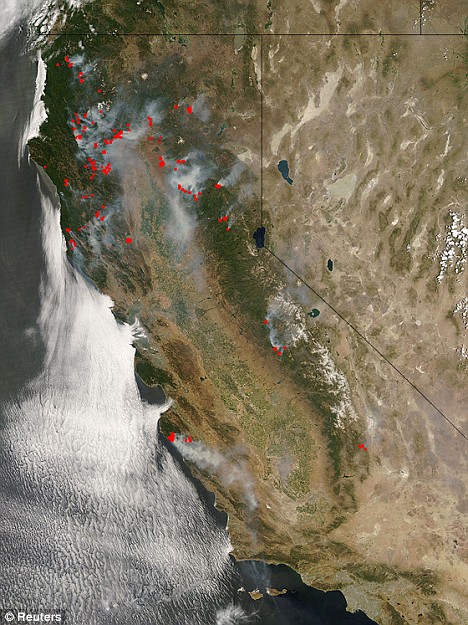 The large-format image is the same spatial resolution as the image above, but shows a wider area of the state, including fires southeast of Los Angeles.