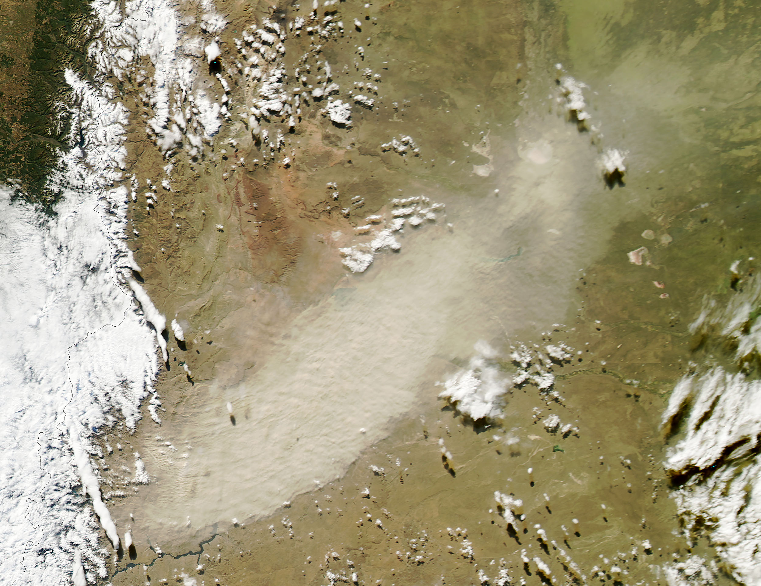 A significant amount of Calbuco’s ejecta came to rest in neighboring Argentina. But some of that material didn’t stay put for long. On May 3, 2015, the Moderate Resolution Imaging Spectroradiometer (MODIS) on NASA’s Aqua satellite acquired the above image of ash resuspended in the atmosphere—that is, it was picked up by low-level winds like debris in a dust storm. Calbuco (not pictured) is located about 100 kilometers (60 miles) southwest from the lower-left corner of this image.