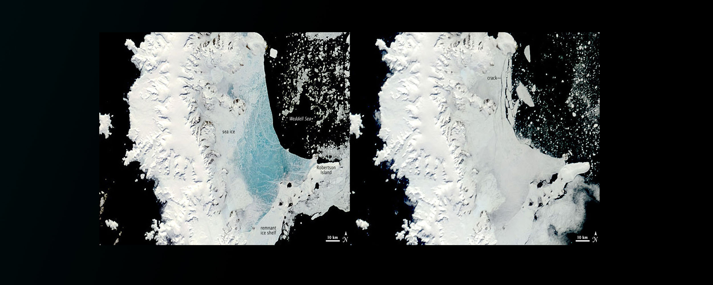 Changing Sea Ice Along Antarctic Peninsula in late 2008 and early 2009. In mid-December 2008, melt water resting on the sea ice colored it sky blue. At the beginning of 2009, however, the sea ice appeared snowy white, and cracks had begun along the ice margin. The Moderate Resolution Imaging Spectroradiometer on NASA’s Terra satellite. They captured these images on December 13, 2008 (left), and January 2, 2009 (right). Both images show the northern portion of the Antarctic Peninsula.