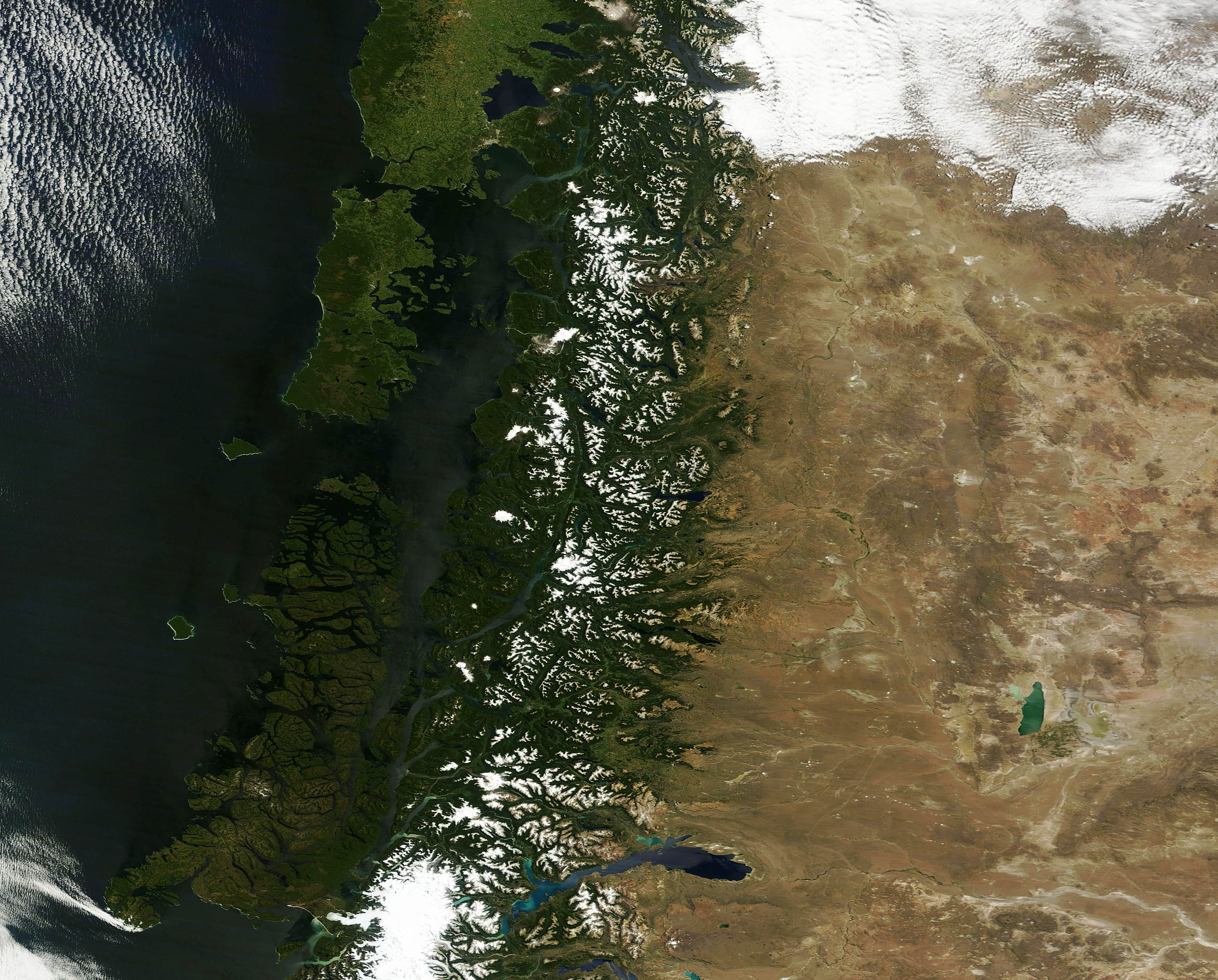 Even in summer, snow caps the tops of the Andes Mountains which run parallel to the coast. The green forests seen in this image represent the Valdivian rain forest, which is South America’s only temperate rain forest. This richly biodiverse forest originally covered 35 million acres in Chile and Argentina, but only about 40% of that original forest remains today.
