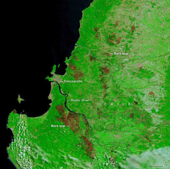 Today’s Image of the Day from NASA Earth Observatory features the aftermath of wildfires that burned across central and southern Chile in early February 2023.