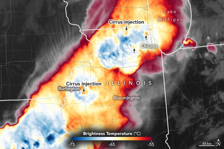 “Notice the plumes of warm air downwind of updrafts – the cold overshooting cloud tops,” said Kristopher Bedka of NASA’s Langley Research Center. “Those are what we call ‘above-anvil cirrus plumes’ (AACPs) – cirrus clouds that were injected into the stratosphere.”