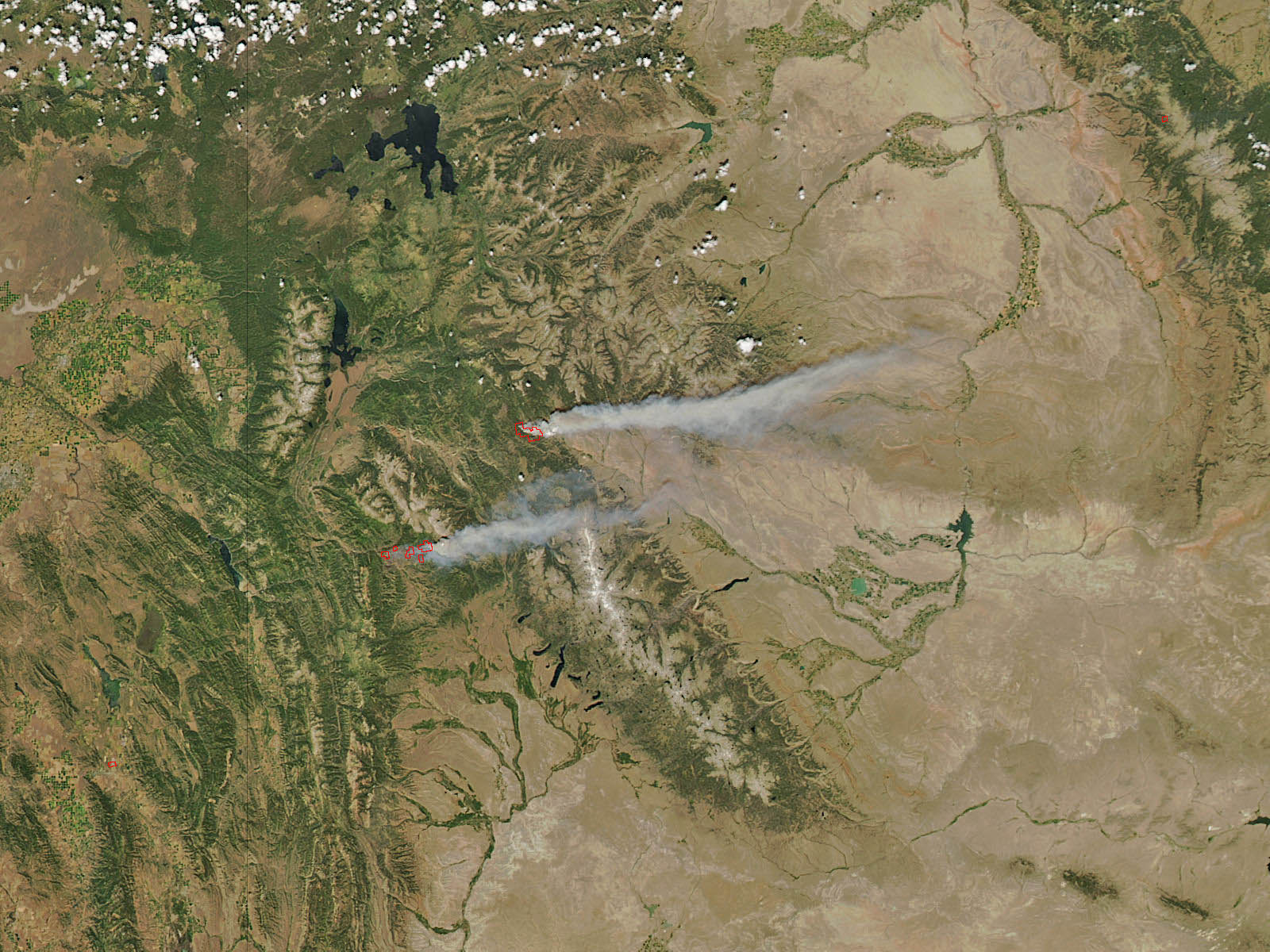 NASA’s Aqua satellite captured this true-color image of two fires, the Cliff Creek Fire and the Lava Mountain Fire on July 23. Cliff Creek and Lava Mountain Fires, Wyoming