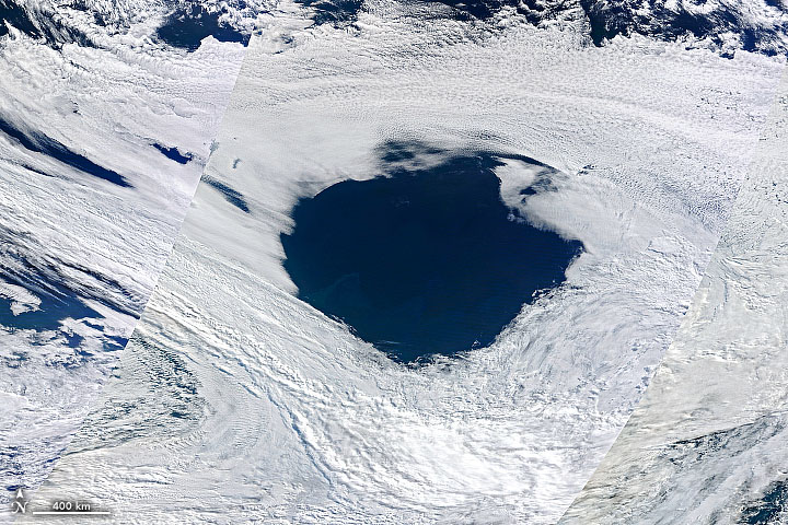 Today’s Image of the Day from NASA Earth Observatory features what appears to be a massive hole in the clouds over the ocean south of the Cape of Good Hope in South Africa. Located between 40 and 60 degrees south of the equator, mariners refer to these turbulent waters as the “Roaring Forties” and “Furious Fifties.”