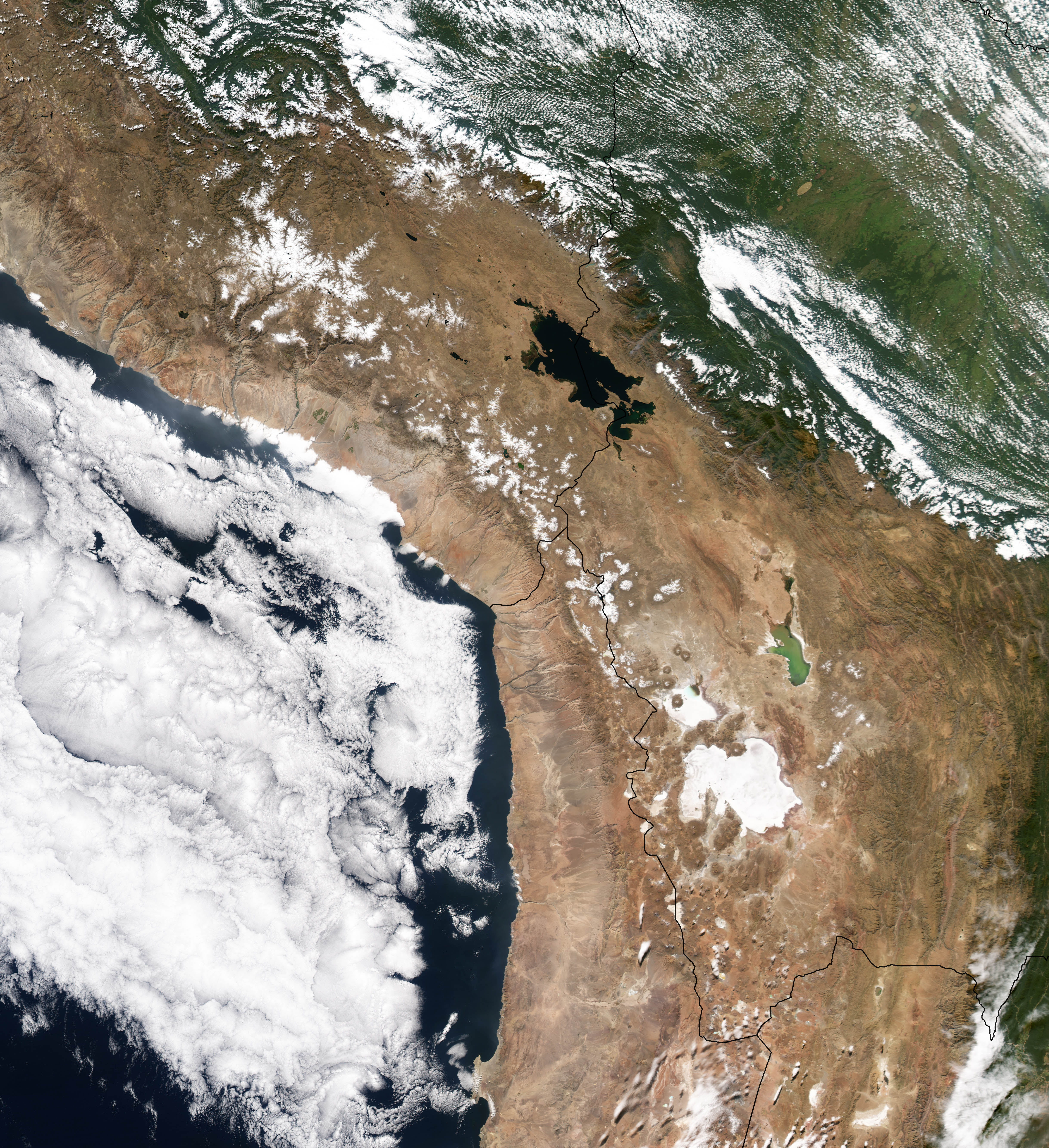 This Moderate Resolution Imaging Spectroradiometer (MODIS) image shows the snow in the mountains of southern Peru and northern Chile and Bolivia. Unlike the clouds that litter the scene, the snow clings to the contours of the mountain peaks. The image was acquired on July 13, 2004, by MODIS on NASA’s Aqua satellite. South America is a continent in the Western Hemisphere, mostly in the Southern Hemisphere, with a relatively small portion in the Northern Hemisphere. It may also be considered a subcontinent of the Americas, which is how it is viewed in the Spanish and Portuguese-speaking regions of the Americas. The reference to South America instead of other regions (like Latin America or the Southern Cone) has increased in the last decades due to changing geopolitical dynamics (in particular, the rise of Brazil)