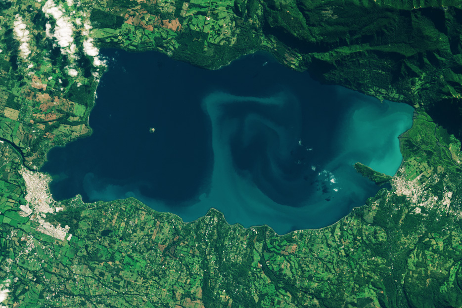 “Lake Villarrica, which sits downslope of the volcano of the same name, attracts visitors with its scenic beaches and recreational opportunities. The lake is flanked by small cities and resort areas on its southern shore, with agricultural areas further afield,” says NASA.
