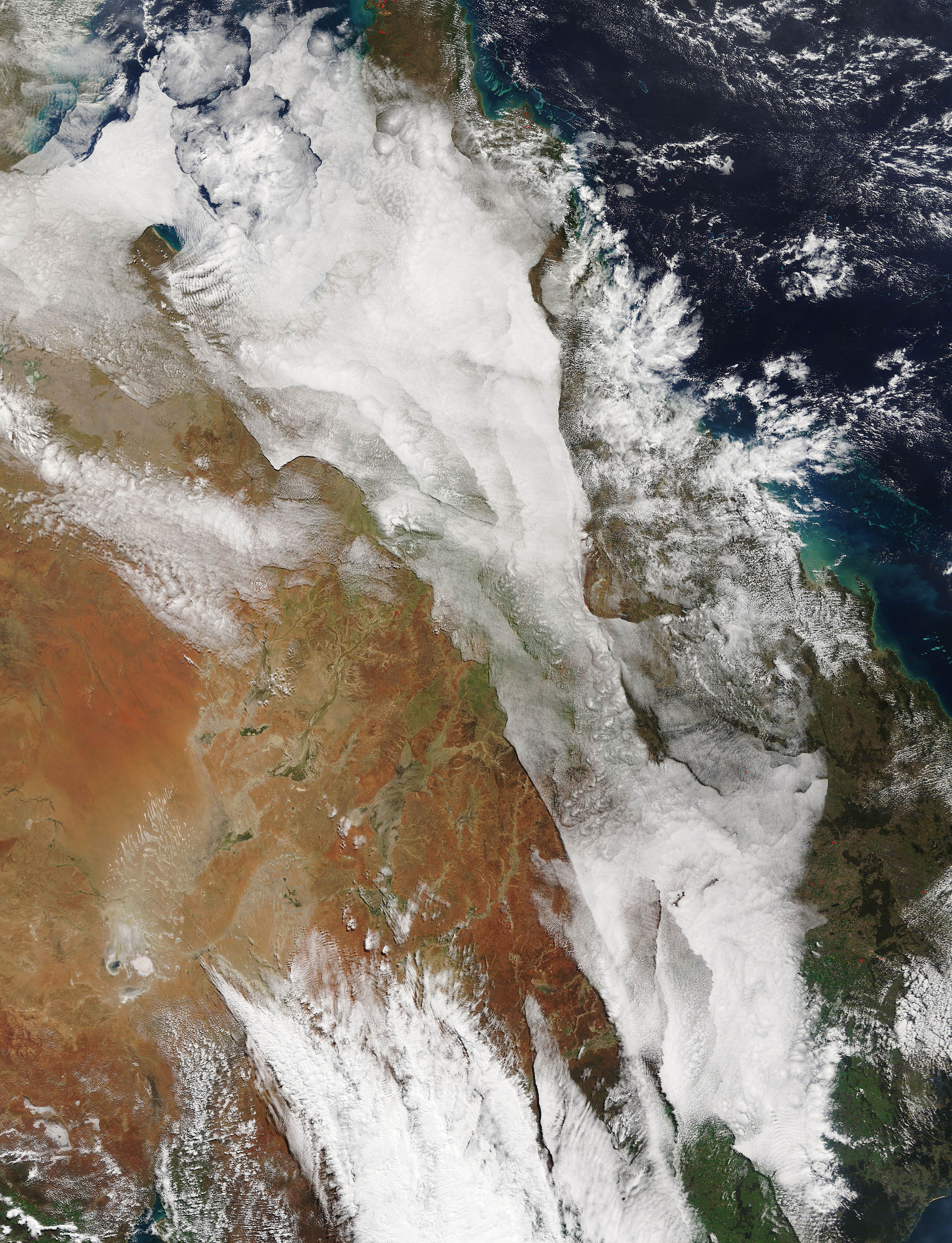 Complex layers of clouds spread across parts of Queensland, Australia.Unsettled weather in mid-August 2016 brought rain and gusty winds to much of southern and western Australia while complex layers of clouds spread across parts of Queensland, Australia. The Moderate Resolution Imaging Spectroradiometer (MODIS) aboard NASA’s Terra satellite captured this true-color image on August 18 at 0045 UTC (10:40 a.m. local time).