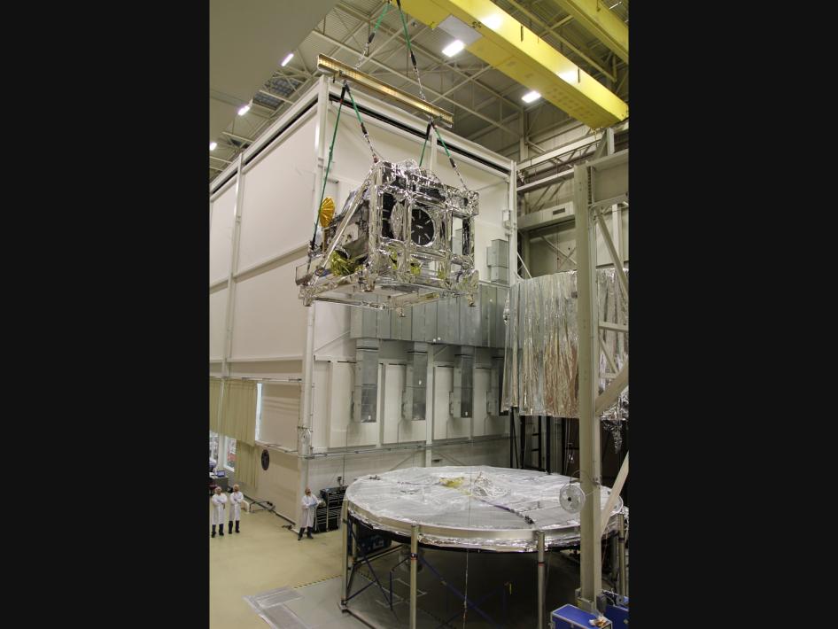 Core Observatory Entering Thermal Vacuum Chamber. On Tuesday Nov. 13, 2012, the GPM observatory moved from the clean room to the thermal vacuum chamber. The spacecraft, wrapped in protective blankets, made the short trip by crane across the testing facility where it was then lowered into the 40-foot test chamber.