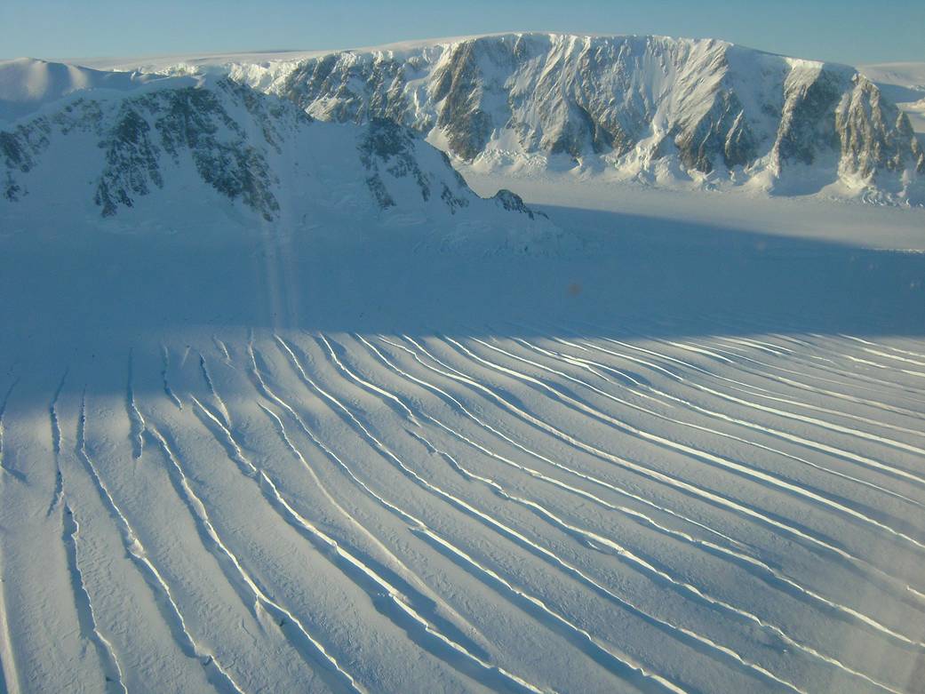 Cracks in Peninsula Ice the ice could be seen during the Operation Ice Bridge flight on Nov. 4, 2009. The low-altitude flight collected data on the Larsen Ice Shelf and numerous glaciers that exist on the Antarctic Peninsula. Credit: Jim Yungel/NASA