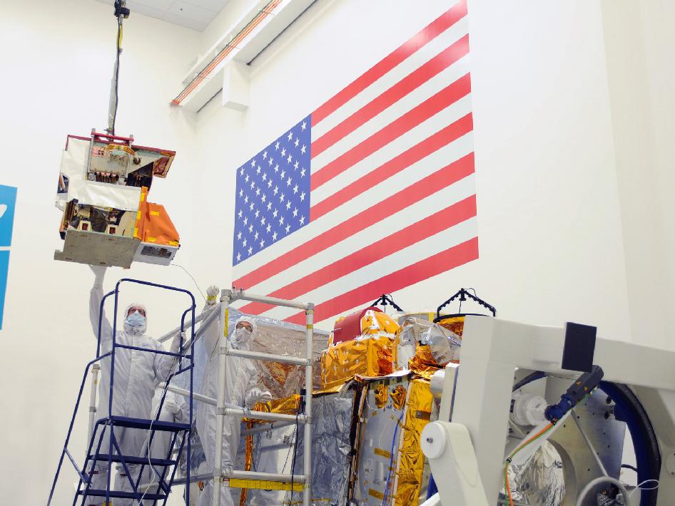 The CrIS Arrives. The last instrument to be added aboard the satellite is the advanced atmospheric sensor called the Cross-track Infrared Sounder (CrIS). Credit: NASA/Ball Aerospace