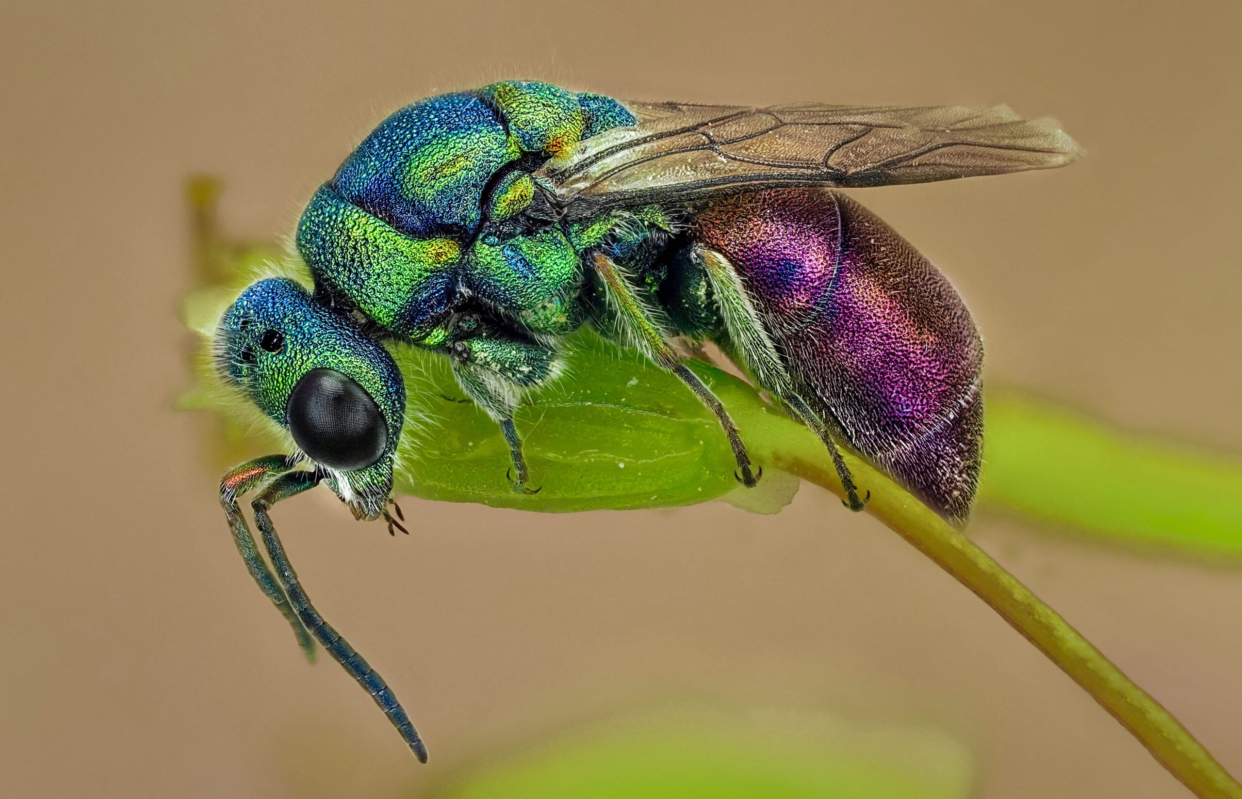 The cuckoo wasp, also known as the emerald wasp, has brilliant metallic colors created by structural coloration. They are found in desert regions around the world.