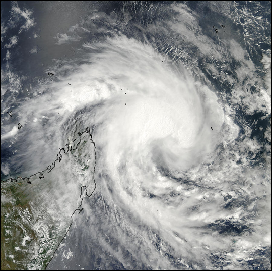 With sustained Cyclone 16S Off Madagascar winds of 84 km per hour (52 mph), Tropical Cyclone 16S has hovered off Madagascar’s northeastern coast for the last couple of days. This true-color image of the storm was acquired on February 10, 2003, by the Moderate Resolution Imaging Spectroradiometer (MODIS) aboard NASA’s Aqua satellite. The high-resolution image available here is 500 meters per pixel. Visit the MODIS Rapid Response Team, for a copy of this scene at MODIS’ full resolution of 250 meters per pixel.