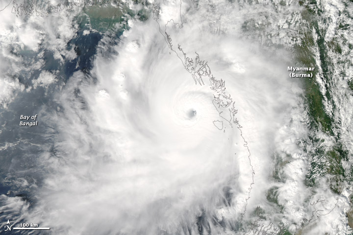 The last large cyclone to strike Myanmar, Cyclone Nargis, had winds of 115 knots (210 km/hr or 130 mph) at its strongest. Nargis hit the low-lying and populated Irrawaddy Delta on May 3, 2008, causing extensive flooding that left more than 100,000 dead. Though stronger than Nargis, Giri was moving toward a less populated and less vulnerable region. The government had issued warnings ahead of the storm, reported CNN.